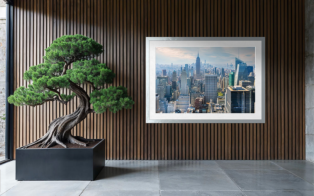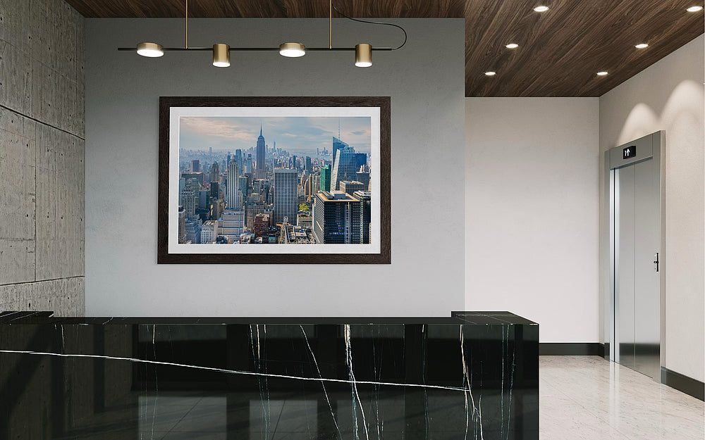 High above New York City from the Rockefeller Rooftop the majestic Empire State Building rises above Midtown Manhattan