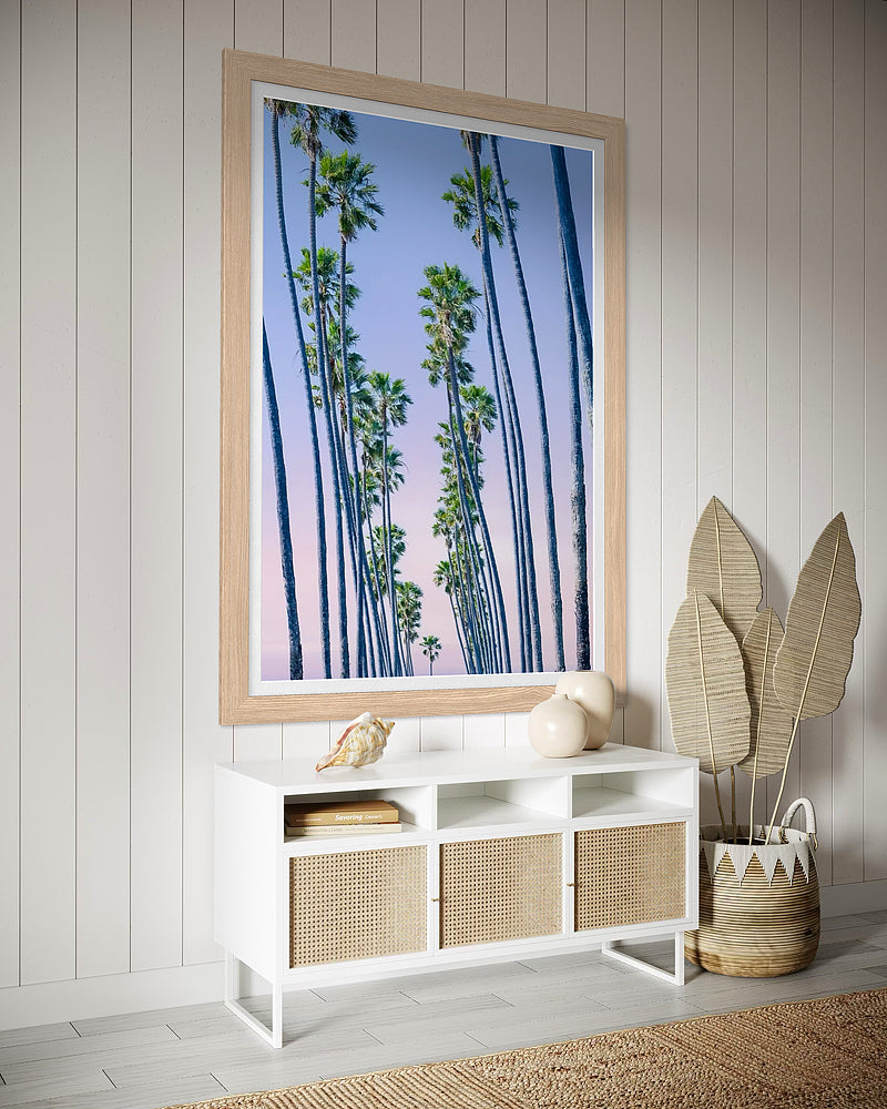 In the early morning light while walking along Ocean Ave in Santa Monica the palm trees that California is famous for are gently swaying in the light breeze.