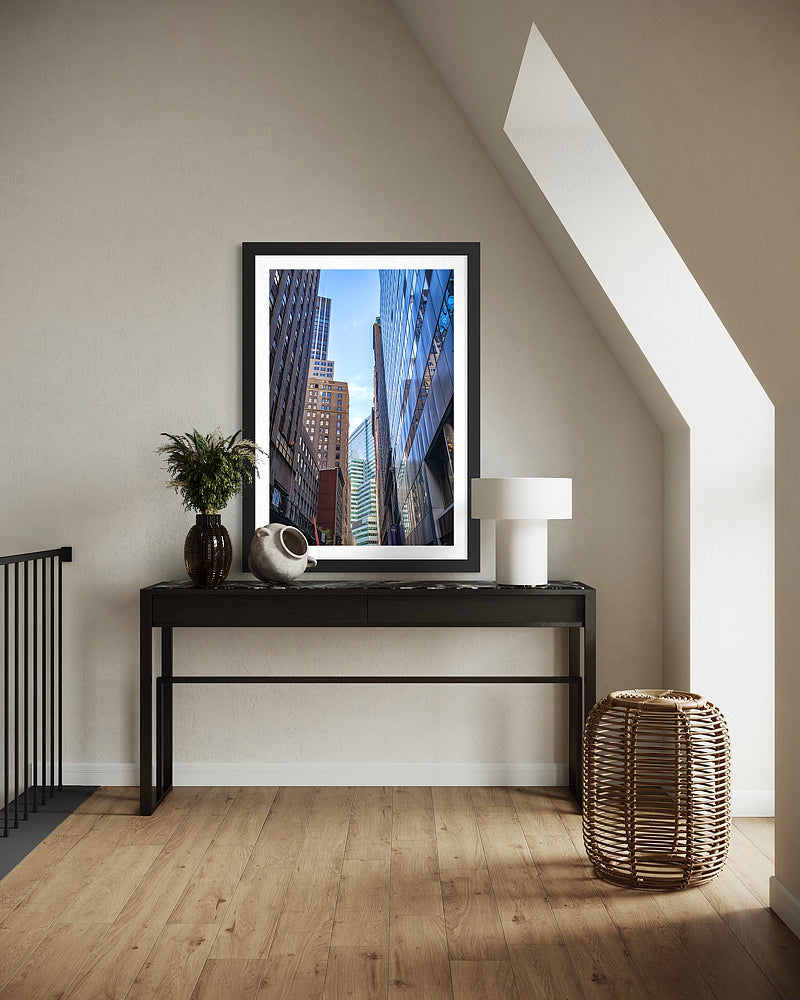 Looking up and through on Wall St, one of the narrow original dutch named streets of New York City