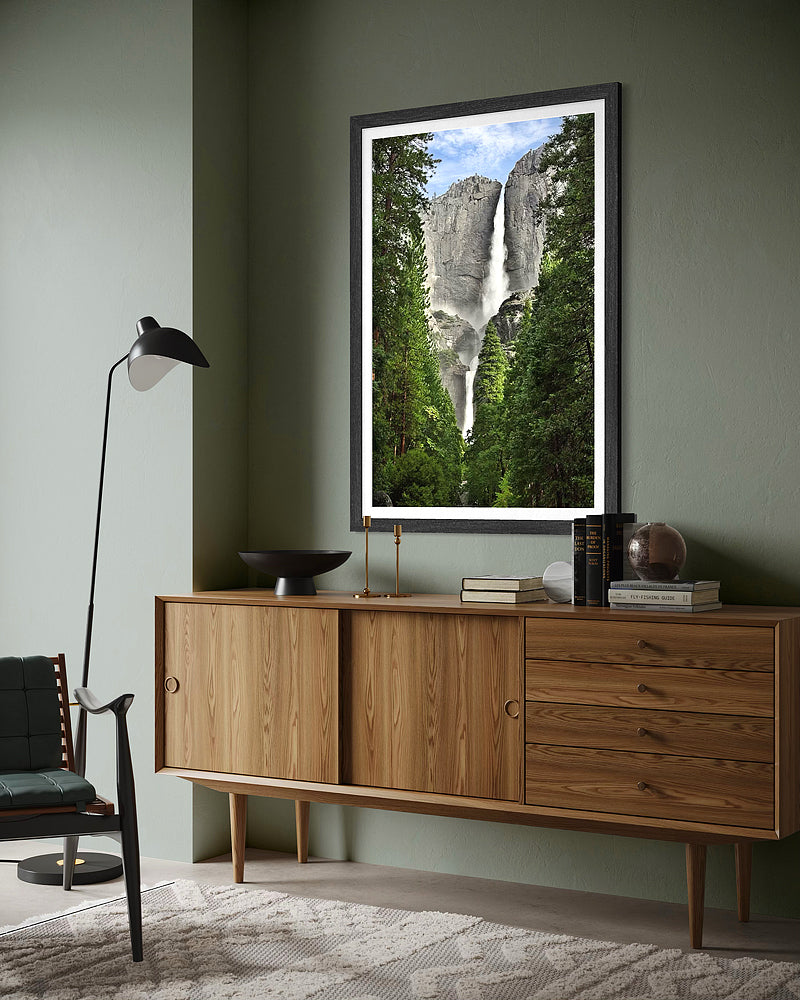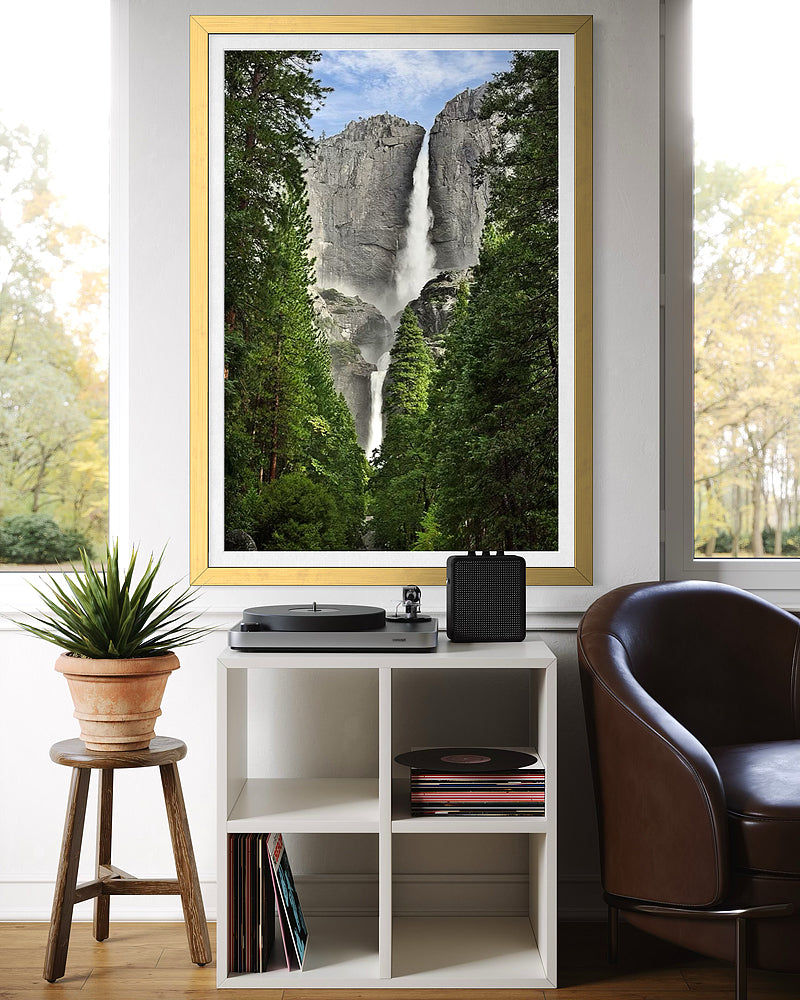 Here you can see both the lower and upper sections of the falls framed by the stunning pine trees that provide a beautiful natural frame for the granite cliffs and Yosemite Falls.